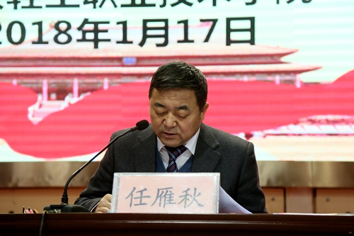 院长任雁秋代表领导班子就学校2017年工作情况、特色亮点、存在问题及2018年工作思路等方面进行述职。他指出,学校在2017年扎实推进国家优质高职院校建设,提高育人质量;积极推进国家高技能人才培训基地建设,提高服务能力;稳步推进国家双创教育示范单位建设,深化创新创业教育;大力推进国家民族团结示范单位和文明校园建设,增强文化底蕴;学生工作扎实开展,群团工作成效显著;服务保障能力逐步增强,办学实力明显提升;构建“大宣传”“大思政”格局,强化思想政治教育和意识形态工作。以融入“一带一路”建设,加强国际合作交流和以助力地方产业发展为目标,实现校企深度融合作为年度工作特色亮点。