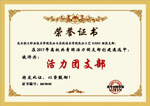 经校内创建、省级遴选、网络投票、专家评审和公示等环节,全国共有1000个团支部被评为全国高校“活力团支部”。我校乳品与农牧技术学院乳品工艺165001班团支部脱颖而出,荣获全国高校“活力团支部”荣誉称号。