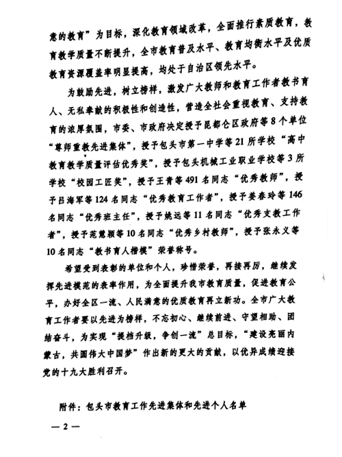近期,包头市委、市政府对教育战线涌现出的先进集体和先进个人进行表彰,学校能源工程学院王彩英老师、化工学院胡智强老师、乳品与农牧技术学院徐莹老师、自动化学院胡月霞老师、创新创业学院王亚非老师、党政办公室刘百顺老师和教务处刘成玉老师获包头市“优秀教师”荣誉称号;自动化学院院长张云龙、招生就业处处长高晓松获得包头市“优秀教育工作者”荣誉称号。希望广大教师向受表彰的先进教师学习,更好地为教书育人、服务社会做出贡献。