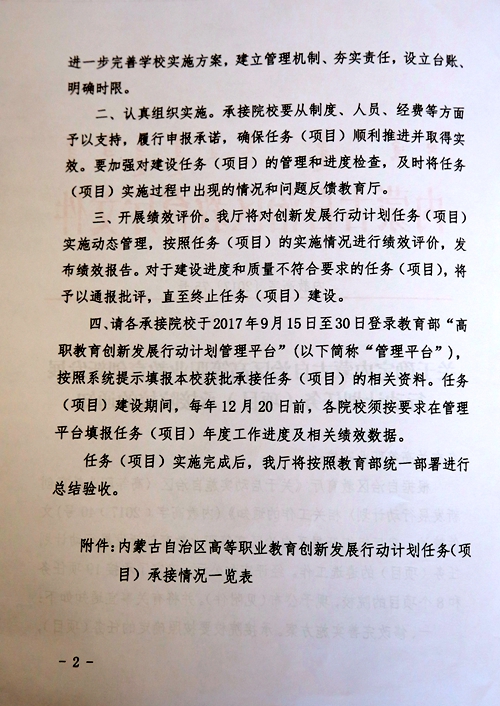 近日,内蒙古自治区教育厅印发了《关于确定内蒙古自治区高等职业教育创新发展行动计划任务(项目)承接院校的通知》(教高字【2017】75号),对承接自治区高等职业教育创新发展行动计划19项任务、8个项目的院校进行了公布。包头轻工职业技术学院获评国家优质专科高等职业院校和自治区级优质校;学院食品加工技术(乳品工艺)、机电一体化技术、工业分析技术三个专业被评为骨干专业;食品营养与检测 、工业分析技术 、药品生产技术三个专业教学资源库被列为自治区级教学资源库;工业分析技术专业“双师型”教师培养培训基地、创新创业课程均获得教育厅立项。