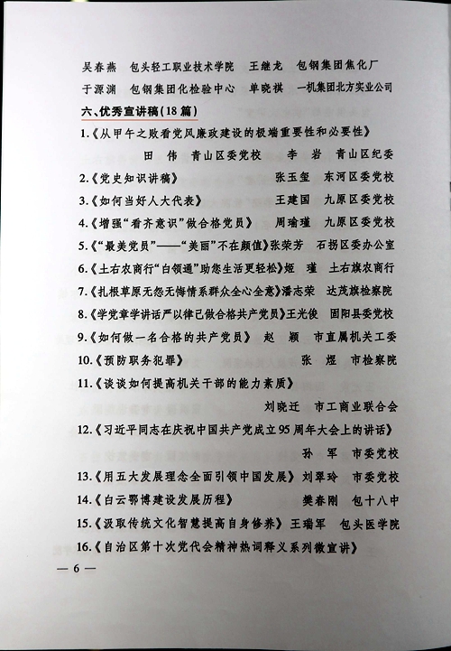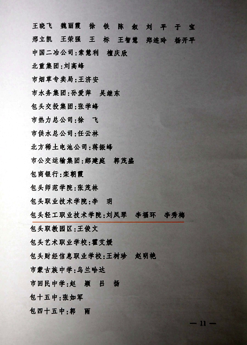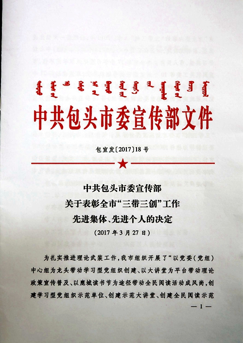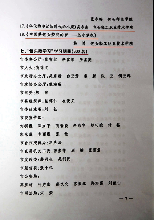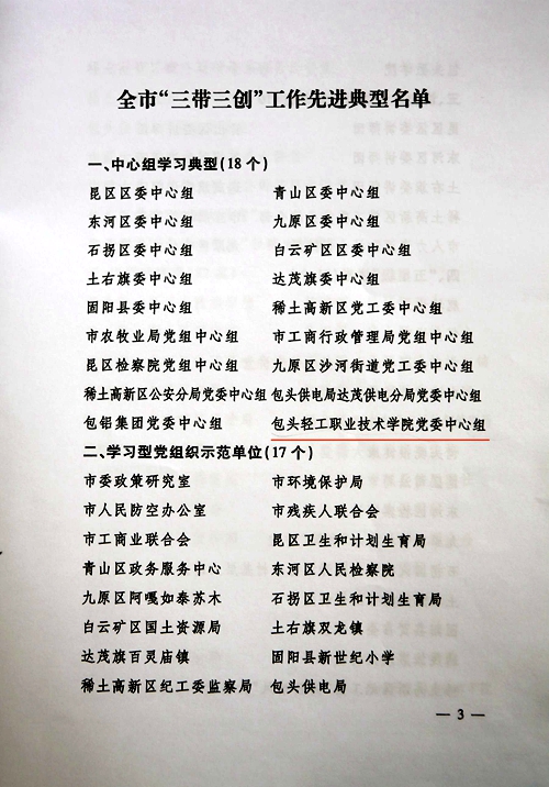 我校党委中心组被中共包头市委宣传部评为“中心组学习典型”,我校“轻院大讲堂”被评为“五星级”讲堂,我校教师韩博被评为“优秀宣讲员”,他撰写的《中国梦包头梦我的梦——坚守梦想》被评为优秀宣讲稿,我校教师吴春燕撰写的《年代的印记新时代的小康》被评为优秀宣讲稿,我校教师刘凤琴、李福环、李秀梅被评为“包头微学习”学习明星。