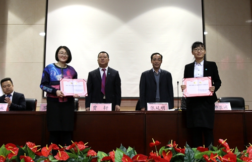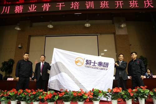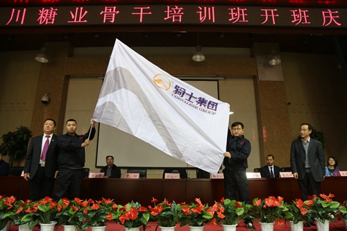 包头轻工职业技术学院党委委员、副院长张延明与蒙古敕勒川糖业有限责任公司副总经理贾轩为敕勒川糖业骨干培训班授旗。