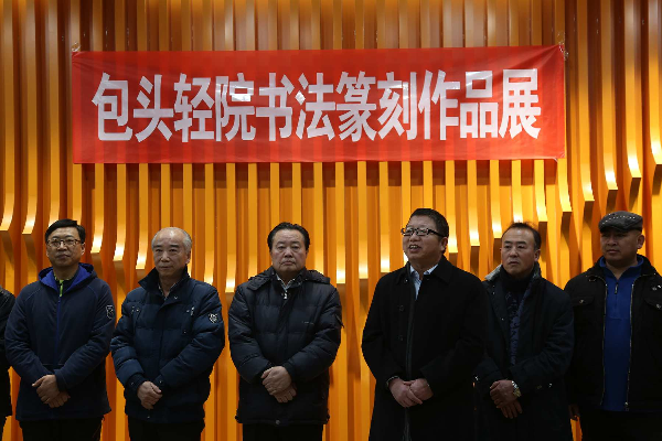 包头市总工会副主席王文海,包头市教科文卫体工会主席陆欣,中国书法家协会会员、内蒙古书法家协会理事、内蒙古科技大学客座教授、包头市书法家协会副主席乔雁,中国教育学会书法教育委员会委员、包头市书法家协会副主席、青山区书协执行主席孙万利,中国书画印国际研究中心篆刻委员会主任、中国印大自在印社社长中国印网总监、内蒙古金石书画院院长青山区文联、九原区文联、东河民族文化馆、土右旗文联、特邀文化志愿服务者贾玉峰,中国书法家协会会员、中国舞台美术学会会员、内蒙古书法家协会会员郑宏涛,中国书法家协会会员、内蒙古书法家协会、青年书法协会创作骨干张志国,包头轻工职业技术学院党委书记敖旭鹏,学院发展战略研究指导委员会副主任、学院书画协会主席侯建平,党委委员、副院长张延明,党委委员、监察审计处处长、工会主席刘青山,党政办公室主任吕林旺等出席参加开幕式。