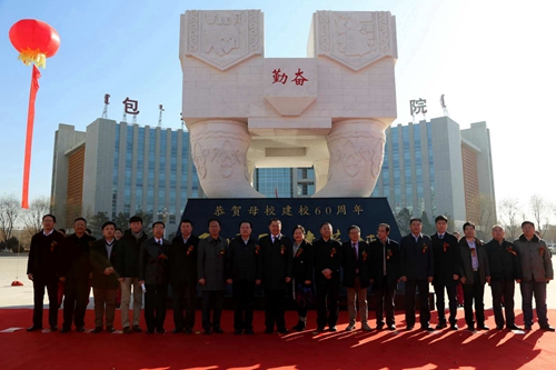 “创业宝鼎”,矗立在包头轻工职业技术学院行知广场中央,面向学校大门,由上下两部分组成,高7米,底座2.4米,鼎身4.6米。上部的鼎由四根牛角支撑,汉白玉制,鼎的四面上方分别刻着,校风“勤奋严谨 务实创新”字样。背景雕花有草原、养牛—挤奶—加工—饮食,表现了“劳动”创造美好生活,专业打造优良品质的画面。底座部分用大理石制,四面分别刻有“恭贺母校建校60周年”校友杨文俊敬立的“中国乳业黄埔”烫金大字、校训“崇尚实践 崇尚技能”、教风“厚德尚能 爱生善教”及校领导敖旭鹏、任雁秋创作的六百六十六字“辉煌轻院”,书写着“轻院60年的辉煌历程”。“创业宝鼎”从提出、勘察、设计、选料加工、运输、制作历时半年的时间,创业宝鼎气势恢宏,意义深远,他代表了6万毕业生的创新意识、创业精神,代表着莘莘学子对母校的感恩之情。