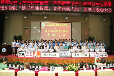 7月7日下午,包头轻院2016年“读书启迪智慧,文化浸润人生”读书月活动表彰大会在图书馆国际会议厅隆重召开。学院党委副书记、院长任雁秋,学院教务长、教务处处长禹文龙,剪纸艺术家要红霞,篆刻艺术家贾玉峰、鹿城读书会会长闫丽、作家胡刃、曹橘、贺志宏,包头市丰色园艺公司经理李瑞艳,武警包头市支队二大队官兵以及其他各位来宾、学院各部门领导、老师、受表彰的先进班集体代表、获奖学生代表、图书馆全体老师等共计326人出席了表彰大会,会议由图书馆馆长助理卜月胜主持。