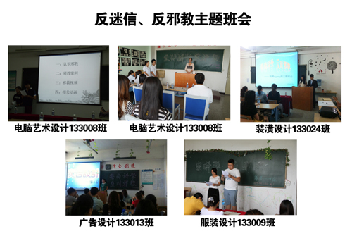 此次观摩活动分两个选题(反邪教、感恩),利用每天课余时间进行,由各班班委组织,班主任进行小结。十场班会各具特色,各有千秋,广告12班创新邀请武警支队教导员讲解反邪教实例;装潢24班建立反邪教微信平台、电美9班签署反邪教倡议书,包装8班着装整齐;包装7班的感恩父母;装潢25班的感恩学校;装潢23班感恩教师;广告13、服装9班感恩同学,在全部班会展示结束后,副院长曹永霞老师对各班班会进行点评,对于各班级班会的亮点曹院长给予了充分肯定,她认为各班级选题切合班级实际情况,教师引导非常到位,班会形式和内容突出,班会进程顺利,师生互动良好,她强调,通过主题班会不仅要锻炼班委会成员的组织协调能力,更要到达增强班级团结力、凝聚力的作用,让学生在团结友爱的班级氛围中发挥正能量,积极自觉地抵制歪风邪气,更好的培育学生的良好品德。