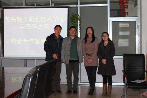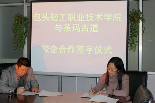 近日,国际学院与包头市奥森茶府(青山区茶玛古道)签订校企合作协议。茶玛古道总经理刘志刚,国际学院副院长张健、院长助理李萍、餐饮旅游教研室主任李涛等出席签约仪式。国际学院挂牌建立青山区奥森茶府人才培养基地”,茶玛古道挂牌建立餐饮管理与服务专业实践教学基地”,以此深入展开合作。今后,校企双方将在社会需求调研和茶艺课程设置、茶艺培养方案设计与实施、学生校内、外专业实训基地建设、校内教师挂职锻炼以及学生实习、实训等几个领域展开合作。